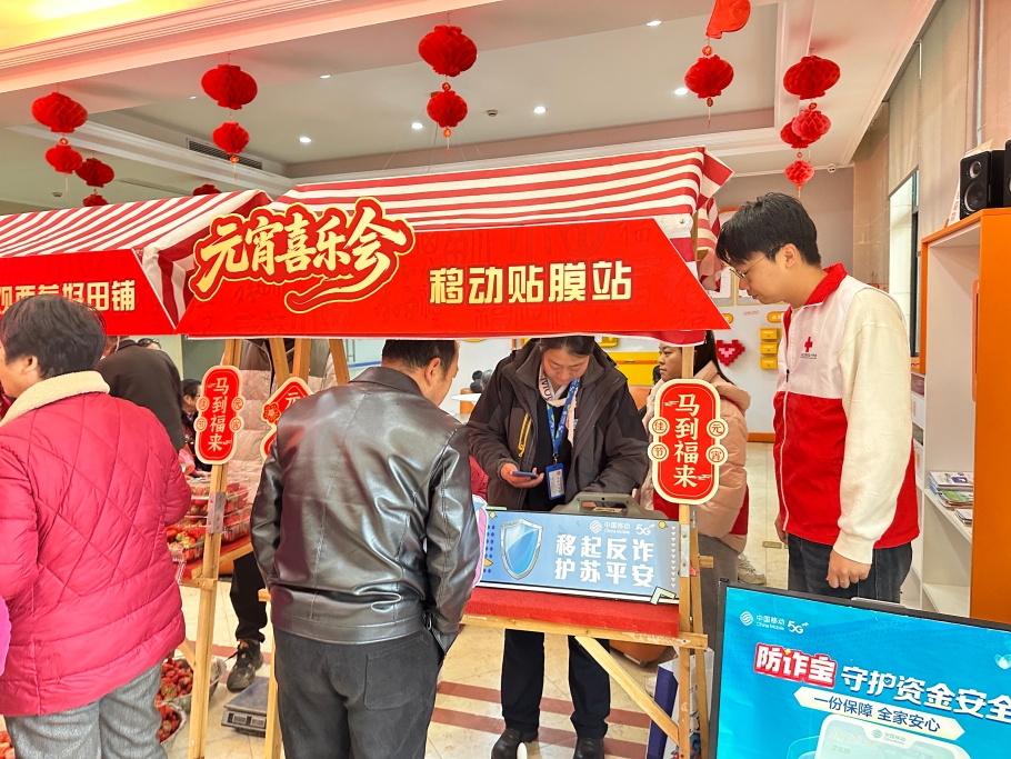 活动现场特设助农产品区,鲜红的草莓、圆润的番茄,以及象征团圆的汤圆,吸引了众多居民驻足选购,既助农增收又传递节日温情。一旁的手机贴膜区,志愿者们用娴熟手法为居民手机换上“新装”,贴心服务赢得连连称赞。